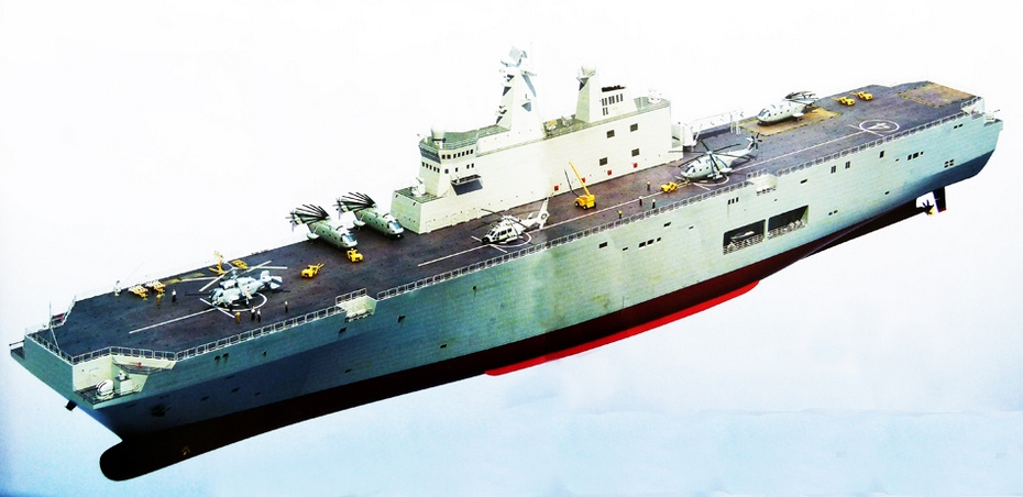 2013年11月18日,据央视新闻节目报道,著名军事专家尹卓海军少将首次透露了中国新型两栖作战舰艇的细节。尹卓海军少将称,新型两栖作战舰艇的吨位是日本海上自卫队的“出云”级直升机航母的一倍半,也就是说如果“出云”级直升机航母排水量为27000至30000吨,那么中国的新一代两栖作战舰艇排水量将达到40000至45000吨。尹卓少将在节目中称,中国研制的“蓝鲸”倾斜旋翼机对登陆作战有重要意义。