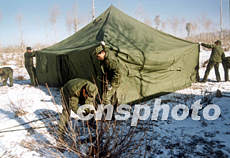 驻守东北地区的解放军部队,十二月冒严寒在草原腹地进行野外演练。图为部队在雪地快速搭建指挥所。作者:马樯
