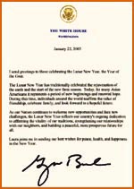 布什总统二十九日发布贺词说,农历新年的传统是庆祝大地复苏和新的耕作时节的开始。如今,对于许多美国亚裔来说,它标示着新开端和新希望的降临。在这段时间里,世界各地的人们重新确认友谊的价值,庆祝家庭团圆,期待着一个充满希望的未来。