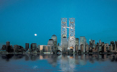 由两名纽约设计师领衔的设计小组提出的方案被称为“二十一世纪的艾菲尔铁塔”,方案希望在世贸遗址上兴建“世界文化中心”,建筑将高达一千六百六十五英尺。