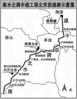 中线调水将由房山入京,过永定河,经京密引水渠到颐和园,使北京京南的房山、大兴、丰台以及门头沟、通州等一向深受缺水困扰的地区得到缓解。同时,北京市重要的用水单位燕山石化、京西工业区、亦庄工业区等也将近水楼台先得月。按照设计,沿线有11个自来水厂,多个分水口,届时,京城以昆明湖的团城湖为结合点,将形成统一的环市区地表水供水网络,加上原有的自来水供水系统,北京城区及其周围卫星城镇的供水保证率将大大提高。