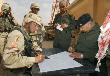 伊拉克西部战区贾拉维将军15日率部1.4万官兵向美军第三步兵师投降,并在距巴格达140公里外的拉马迪与美军第三步兵师第四旅指挥官在投降书上签字。