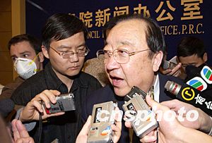 国务院新闻办公室二十日下午举行有关“非典”的新闻发布会。会后,中国卫生部副部长朱庆生被中外记者采访。作者:张炜