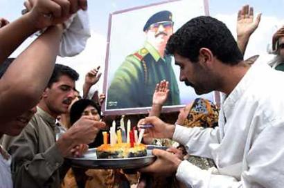 28日当天,提克里克出现了数十名“不持枪”的萨达姆死党,只见他们围着一个自制的生日蛋糕和萨达姆画像,在住家附近街头又唱又跳,充分展示其对这位前总统的支持。不少年轻的女孩子也举着萨达姆画像出现在街头并高喊,“我们愿意为他牺牲一切”。不过,发觉风声的美军很快开着步兵战车出现在街头,并在其他巡逻人员配合下,强行结束了这个自发举行的“生日晚会”。为此,许多当地人表示,“我们想用和平方式来为萨达姆祝寿,美国鼓吹的言论自由哪里去了”?