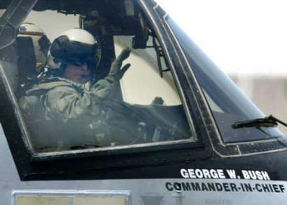 但布什特意穿着橄榄绿色的飞行服、足蹬作战靴、戴着飞行头盔,坐在副驾驶的位置上,光临“林肯号”。动身前,为防万一,他在白宫的游泳池里接受了水下救护训练;上飞机前,也听了弹射跳伞的操作讲解。