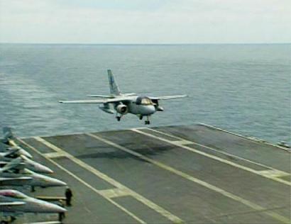 查资料才发现,做好防护准备是有道理的:布什坐的S-3B“海盗式”喷气式侦察机,采用“拦截式”方法在航空母舰上降落。也就是说,飞机以二、三百公里的时速着陆时,要靠飞机的制动勾抓住拦截索,产生阻力,在一百多米内的航母甲板跑道上完全停住。四月一日,对伊战争期间,有过一架同类型的S-3B飞机,降落时没停住,从“星座号”航空母舰上滑到了海里。