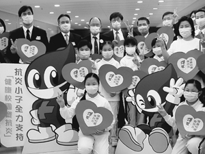 香港部分教育界人士和学生与“健康校园齐抗炎”活动卡通代言人“抗炎小子”合影,希望集合民间力量将SARS击溃。香港《文汇报》供稿