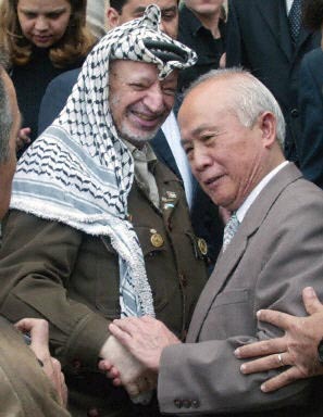 中国中东问题特使王世杰(右)2002年11月13日上午在约旦河西岸城市拉姆安拉会见了巴勒斯坦民族权力机构主席阿拉法特(资料图片)