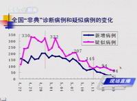 从全国非典临床诊断病例的变化趋势可以看出,从5月13日以来,全国非典临床诊断病例呈平稳的下降趋势,5月13日是80例,到19日是12例,这个过程比较平稳,下降的幅度也比较大。而疑似病例从5月13日以来也呈下降趋势。