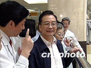 据中国中央电视台报道,今天上午9时,温家宝和中共中央政治局委员、国务院副总理吴仪,在中共中央政治局委员、北京市委书记刘淇,北京市代市长王岐山陪同下,来到北京儿童医院新门诊大楼。这里拥有国际一流的就诊环境和诊疗手段,日门诊量可满足近万名患儿就诊。