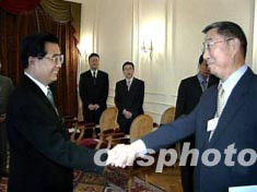 中国国家主席胡锦涛六月二日在瑞士会见国际著名物理学家、诺贝尔奖获得者丁肇中时,认真听取了丁肇中关于他近年来工作和下一步设想的介绍,特别是有关阿尔法磁谱仪研究项目的情况。中新社 图