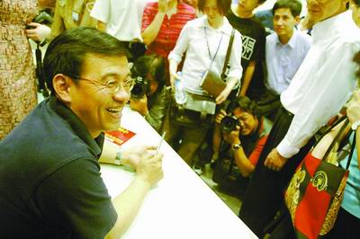 昨天,出现在上海书城的王志不吝啬自己的笑。他经常抬起头来,向等待签名的读者憨厚一笑。这无疑让看惯了他深沉严肃表情的人心生疑惑,以至于一个不知所措的小伙子,猛地问出一句:“王志,你也会笑?”当然,回答他的是王志爽朗的笑声。