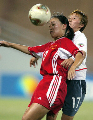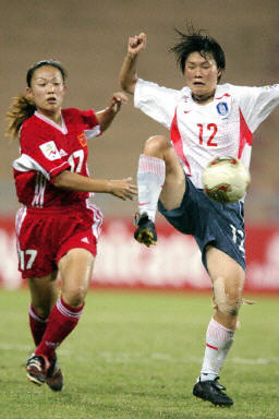 下半场中国依然对韩国队保持着很大的压力,并在下半场结束时由孙雯带球突破后射门得手,将场上比分扩大为三比一。