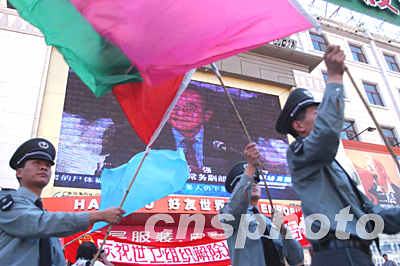 六月二十四日,世界卫生组织撤销对北京的旅行警告,并将北京从非典疫区名单中删除。王府井街头观看直播的保安获悉消息,挥旗相庆。 中新社记者:武仲林