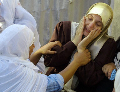 一名巴勒斯坦女人悲伤的痛哭,她的亲人在巴以冲突中死亡。