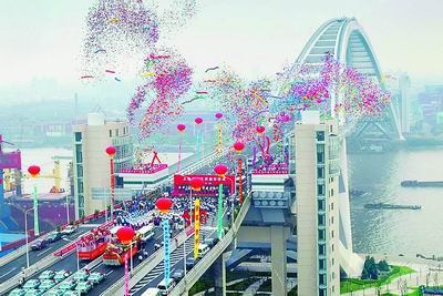 中新网6月28日电 由江泽民亲笔题写桥名、有“世界第一拱”之称的黄浦江越江大桥——上海卢浦大桥工程,今天上午10时建成通车,这是上海越江工程建设取得的又一丰硕成果。