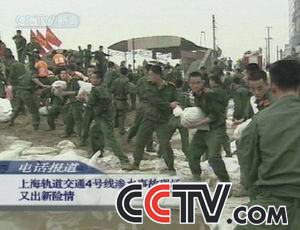 中新网7月3日电 据中央电视台报道,今天下午1:30分,上海轨道交通4号线渗水事故险情出现新变化,由武警战士用了6个多小时围起的防护堤突然坍塌。