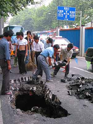 据介绍,南京的地质状况较复杂,地下水位高,有较多的古河道及大量含水砂层、断裂破碎带、软流塑地层等不同地质情况。昨日塌陷的两处位于新街口闹市区,一处在三元巷加油站门口,另一处在新街口转盘的东南角。两处塌陷时间大约在下午4时左右,塌陷后没有造成人员伤亡,但给新街口的交通造成一定影响。市政部门立即在塌陷处设置了警示标志,并有交警在现场指挥交通。下午5时多,南京市政110的赶来抢修。