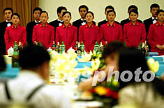 四日晚,整装待命的侍应生在人民大会堂金色大厅内迎候来京旅游的香港和韩国、澳大利亚的549名游客。北京旅游局从即日起将陆续在大会堂宴请北京“双解除”后的境内外游客。中新社记者 郑萍萍 摄