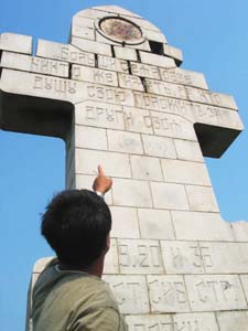 这座由沙俄建立的纪念碑呈十字架形,高6米,宽0.7米,以灰白色花岗岩砌筑,碑的上端镶嵌着圆形彩色“圣母”头像,下面镌刻着俄文。日期为1904至1905年,即“日俄战争”的时间。