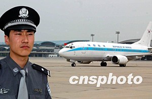 韩国总统卢武铉七日乘专机飞抵北京开始其访华行程,机场人员加强警戒确保安全。中新社记者:满会乔