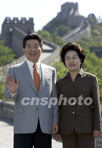 卢武铉与夫人登上北京八达岭长城。中新社记者:毛建军