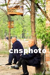 北京两位老人在公园里遛鸟。图/中新社 摄影/鲁谷