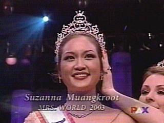 来自全球39位佳丽齐聚美国拉斯维加斯,为争取2003年世界太太的桂冠使出混身解数。来自泰国的苏珊娜在机智问答中,以沉着稳重的气度舒展大将之风,她被问到的题目是为什么希望成为世界太太。她回答:“因为我知道戴上了皇冠就付予我舒展现代女子的能力,无论在泰国、美国、或任何地方,舒展出我们高贵有教养,有能力,并舒展我们很爱家人的道德。”除了机智问答赢得评审注意,苏珊娜在才艺表演中,以烹调色香味俱全的泰国料理吸引评审。最后她在38名佳丽中脱颖而出,戴上桂冠。