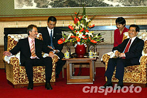 中国国家主席胡锦涛二十一日在北京会见英国首相布莱尔。中新社记者:满会乔