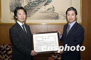 由中国新闻社日本分社与日本新秦公司联合发起的防治“非典”网上募捐活动日前结束,南起冲绳,北至北海道,日本民众、团体及在日华侨华人踊跃捐资,五十七万日元捐款8月1日送交中国驻日大使馆,请其转交中国有关部门。图为中国驻日使馆李文亮参赞向新秦社长端木正和授予感谢状,并请他转达对各位捐款者的衷心感谢。中新社记者:陶光雄