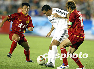 西班牙皇家马德里足球队与中国健力宝龙队的比赛八月二日晚在北京工人体育场举行。图为罗纳尔多被中国龙队队员前后夹击防守。中新社记者:毛建军