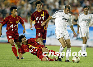 西班牙皇家马德里足球队与中国健力宝龙队的比赛八月二日晚在北京工人体育场举行。图为龙队队员飞身铲断齐达内的带球进攻。中新社记者:毛建军