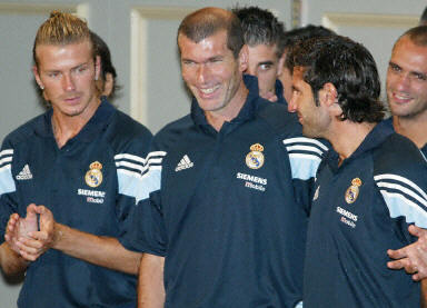 当地时间8月4日上午,日本方面为皇马举行了隆重的欢迎仪式,图为贝克汉姆和齐达内等在发布会上。