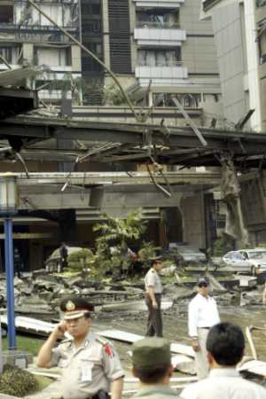8月5日,印尼首都雅加达南部的中心商业区万豪酒店发生剧烈爆炸。周围几幢建筑也受到爆炸冲击。据印尼警方称,到目前为止至少有8人在爆炸中死亡,另有103人重伤。(春风)