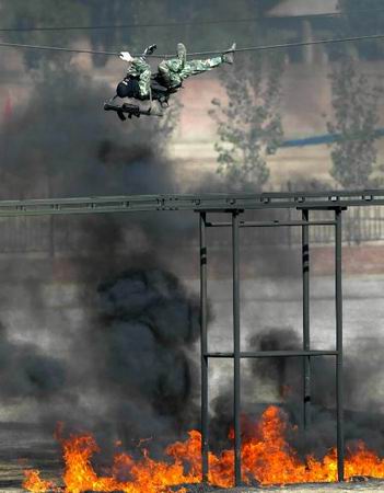 中新网8月11日电 今天上午,武警部队在北京南郊成功举行处置突发事件综合演练。从利用装甲防暴车车载机枪对固定目标射击到计算机模拟战斗射击,从液压式切割链锯效能展示到动力飞行器飞行技能演示,从处置武装袭击事件到处置大规模劫持人质事件,由1500名武警官兵参加的综合演练高潮迭起。