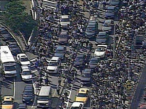 纽约市内街道上挤满车辆,动弹不得。位于三十四街和第七大道口的宾州车站一片漆黑,街上挤满了人。