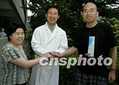 北京SARS医疗专家、人民医院ICU主任安友仲教授,8月15日到北京地坛医院祝贺将于16日出院的中国最后两名SARS康复患者孙峥(右)、卢志艳(中)。安友仲教授曾在过去的三个月内分别参予这两名患者的转院抢救治疗。中新社记者:任晨鸣