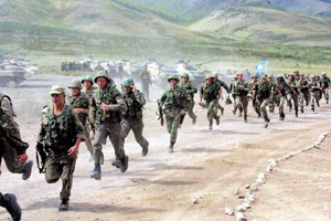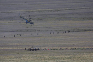 8月7日,哈萨克斯坦乌恰拉尔某空军基地。平静的晴空中,传来飞机的轰鸣,两架苏—27战斗机,紧紧挤压着一架安—26型客机,向机场跑道滑落,惊险紧张的反劫机演习正在进行。同一天,五国部队还进行了“解救人质”演习。