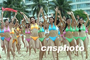 经过几天在海南三亚的赛前培训,九月十日,参加2003年新丝路中国模特大赛的五十一名佳丽到海滩上放松心情,舒缓大赛前的紧张气氛。中新社记者:盛佳鹏