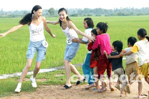 参加第五十三届世界小姐中国总决赛的选手十六日拍摄外景时,在三亚乡间与农家孩子玩起“老鹰捉小鸡”的游戏。中新社记者:毛建军