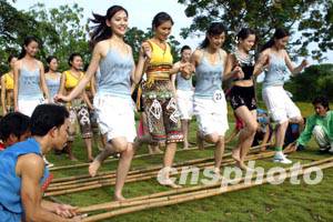 组图:世界小姐中国总决赛参赛选手学习黎族竹竿舞 (2003-09-17 11:10:13)
