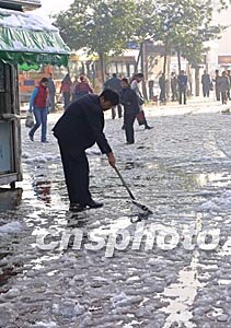 二十七日晚,受冷空气影响,入秋以来的第一场降雪悄然光临乌鲁木齐市。二十八日一早,市民及时清理道路上的积雪,方便行人出行。作者:刘新