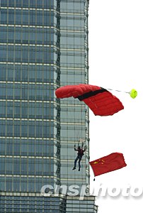 世界顶级高楼跳伞运动员如雄鹰展翅般从中华第一高楼上海金茂大厦的八十八层平台纵身飞跃,骤然降落,那一朵朵色彩纷呈的伞花飘逸而下,博得在场观众的阵阵喝彩。今日有着“中华第一跳”美称的上海金茂大厦高楼跳伞着实让一向见多识广的申城市民大开眼界,随着跳伞表演的如期举行,一切相关的悬念也随之揭开了神秘的面纱。