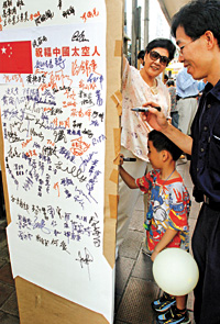 一位与父母刚逛完街预备回家的9岁男童施俊匡,在祝福卡纸上签名支持及祝福航天员。而爸爸施先生亦认同,中国载人宇宙飞船升空是中国人的骄傲,因此希望签名送上一点祝福。