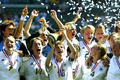 北京时间今天凌晨3时许结束的第四届女足世界杯决赛中,德国队与瑞典队在90分钟的比赛中战成了1-1平。在加时赛中,德国队凭借着后卫金策尔的一粒金球让瑞典队饮恨美利坚,他们也因此成为该项赛事的新科状元。德国队头号射手普林茨夺取了金靴奖和金球奖两项大奖。图为德国队员棒杯欢呼。