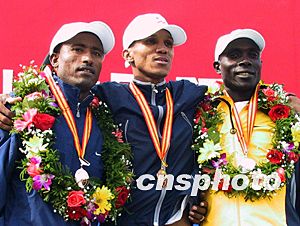 北京秋高气爽的好天气为长跑运动员赛出好成绩创造了条件。来自南非的伊安·西斯特在男子组比赛中一路领先,最终以二小时七分四十九秒的好成绩取得冠军。该成绩是北京国际马拉松赛男子组历史第二好成绩。