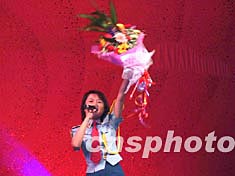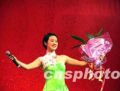 解放军空军十六日晚为中国航天科工集团公司061基地进行专场文艺演出,图为女演员哈晖演唱歌曲《越来越好》。中新社记者 孙自法 摄