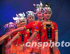 在空军为中国航天科工集团061基地进行的专场慰问演出中,061基地员工自编自演民族舞蹈《苗家欢歌》(一)。中新社记者 孙自法 摄