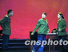 空政话剧团演员在专场慰问演出中,为中国航天科工集团公司061基地表演小品《连长·媳妇·兵》。中新社记者 孙自法 摄