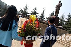 毛泽东诞辰一百一十周年前夕,中国各地的游客纷纷前往湖南韶山参观毛主席故居,缅怀一代伟人。图为广东游客在毛主席铜像广场敬献花蓝,以表崇敬之意。中新社记者:张宇